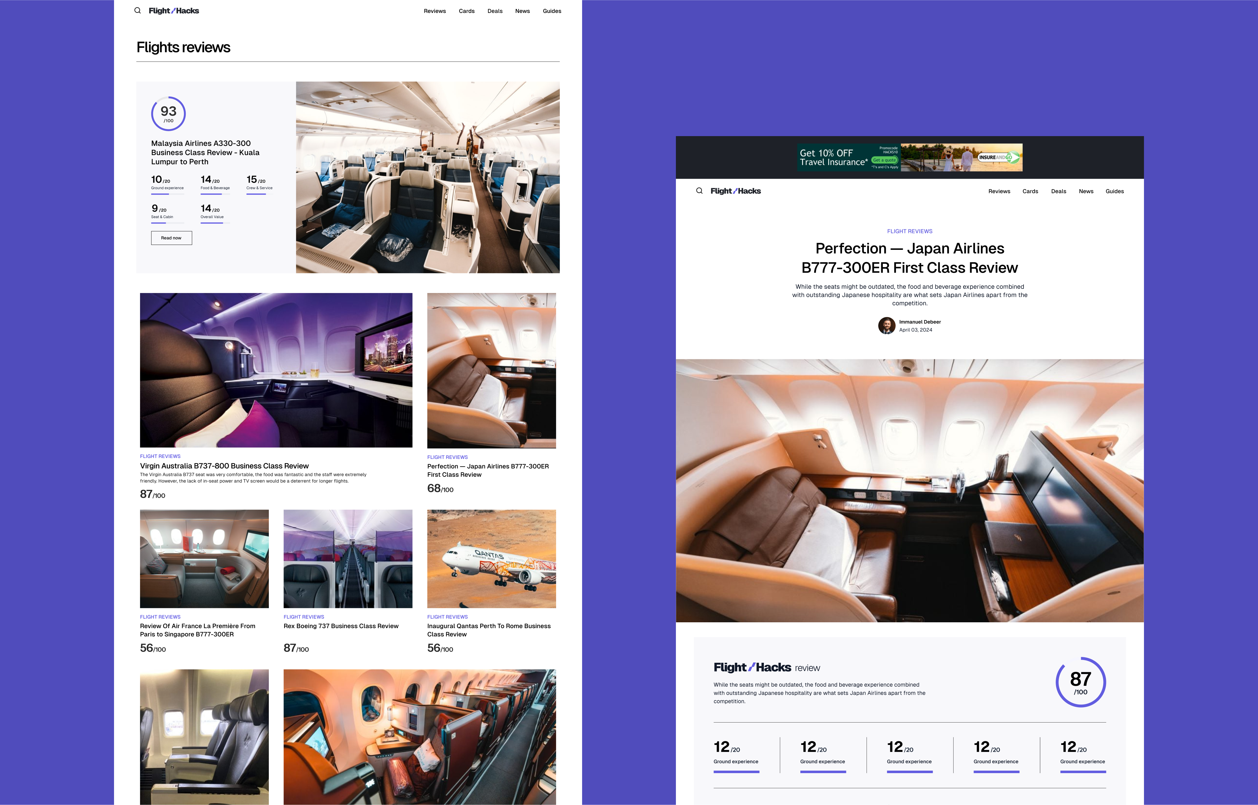 A major requirement for the new website was the ability to facilitate easy content updates while maintaining strong interconnectivity between articles. With a vast library of reviews and guides, Flight Hacks needed a solution that would not only improve content organisation but also enhance engagement and usability for their audience. Additionally, the design had to accommodate various content formats, including images, tables, and ads, without compromising readability and aesthetics.